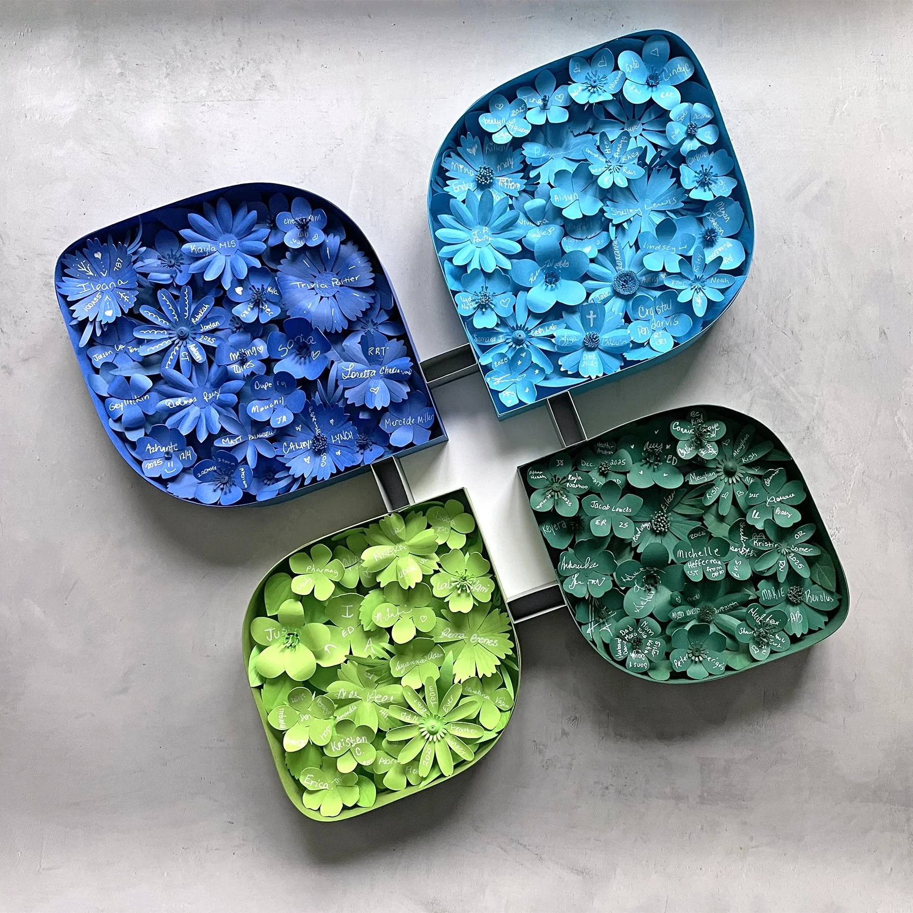Hundreds of cut paper flowers, inspired by Florida native plants, were given to staff to sign and personalize. Each flower was then hand-sculpted and arranged into oversized 3D letters in AdventHealth’s brand color palette.